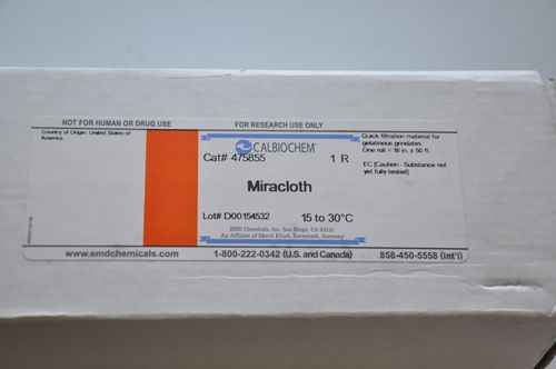 Calbiochem公司貨號為475855的Miracloth一卷目前價格在1000元左右,不過Size很大,有18英寸寬50英尺長,室溫保存2年。要用多少就剪多少,和濾紙或者濾布一樣配合漏斗使用,***可以擠壓一下,還算挺結實的。使用中注意,Miracloth可以耐受高溫消毒,但不耐堿,在pH>9的溶液會解離。